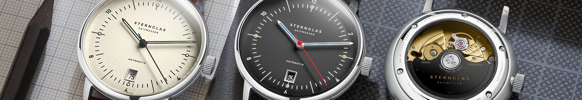 Seit 2016 steht STERNGLAS für klare Formen, hochwertige Materialien und ehrliches Uhrendesign nach Bauhaus-Prinzipien. Die junge Hamburger Uhrenmarke fertigt Quarz- und Automatikuhren, die durch präzise Technik, hochwertige Verarbeitung und ein ausgezeichnetes Preis-Leistungs-Verhältnis überzeugen.
